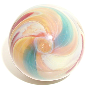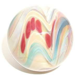 #06-30-02_01 Size: 1-9/16" $50.00 Made: June 30, 2002 Glass: Borosilicate (Pyrex®) & NorthStar®; Ruby & Blue on Caramel Owner: Jodi Green Date Acquired: September 18, 2003